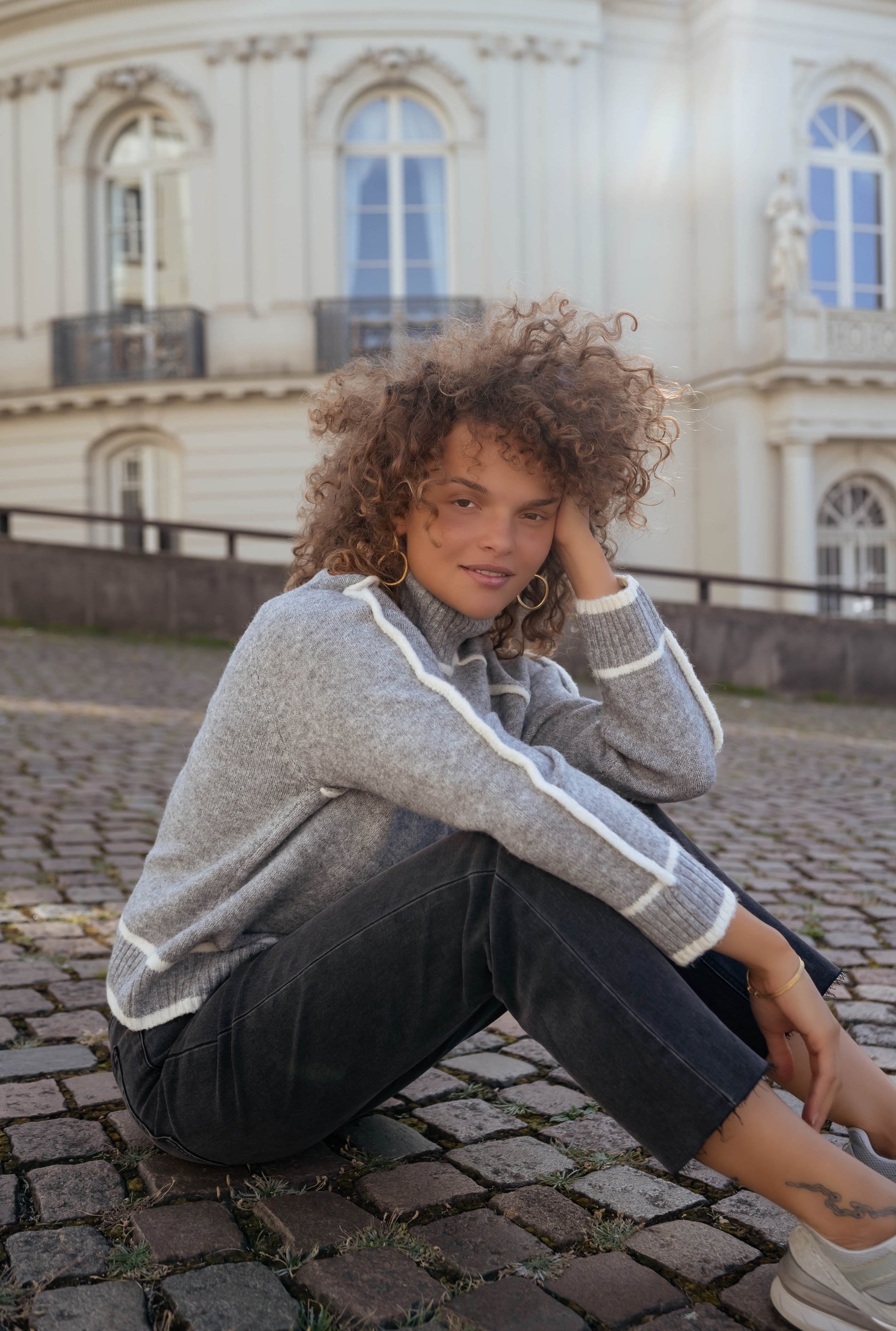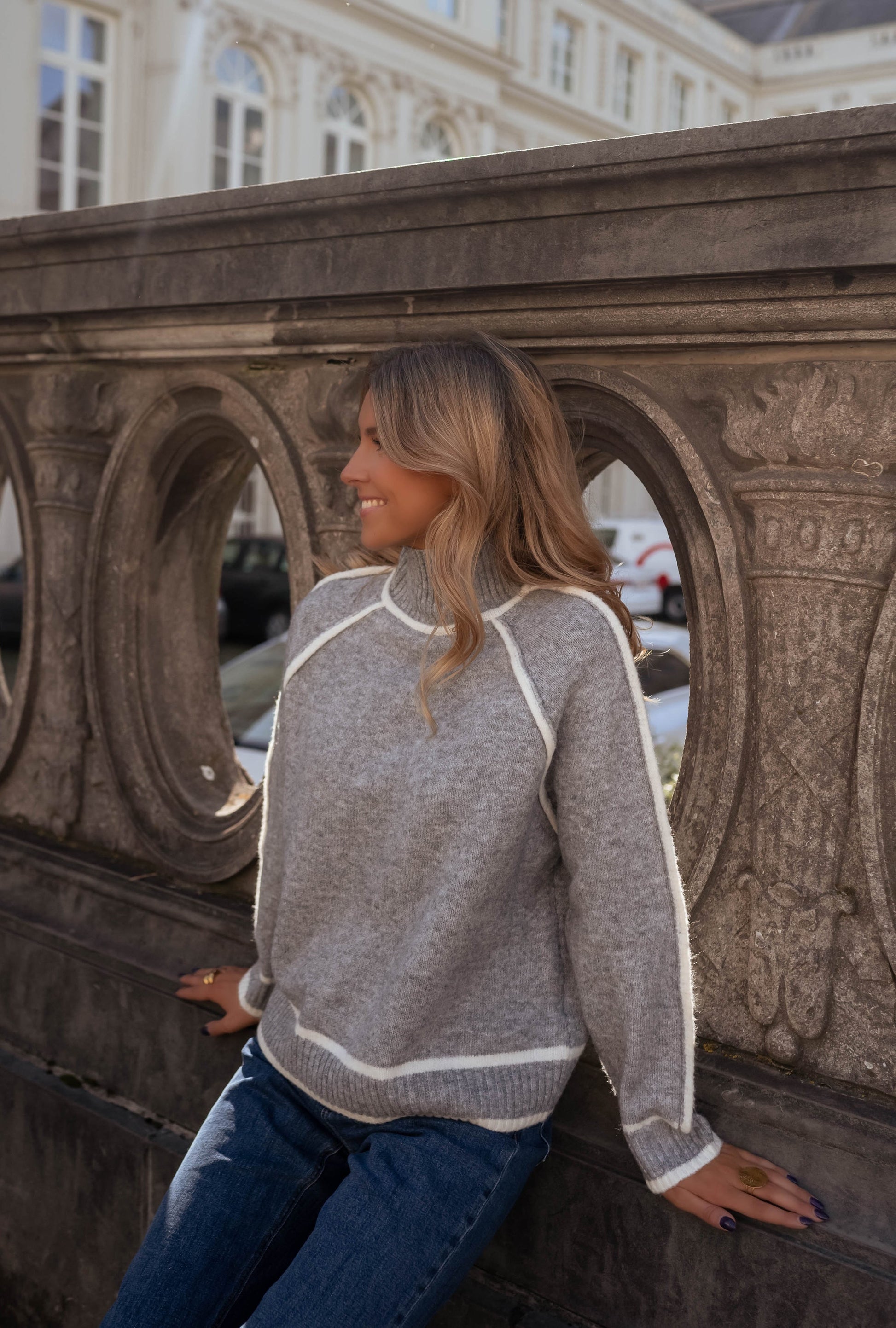 Wie ein sanfter Nebel über stillen Wintermorgen hüllt Amelie™ | Grauer Strickpullover dich in leise Eleganz. Der ecrufarbene Akzent zeichnet zarte Linien, der Stehkragen rahmt dein Lächeln – und plötzlich wird Wärme zu Stil, Gemütlichkeit zu Ausstrahlung. Amelie ist nicht nur ein Pullover, sondern ein Versprechen: feminin, kultiviert, unwiderstehlich ruhig.